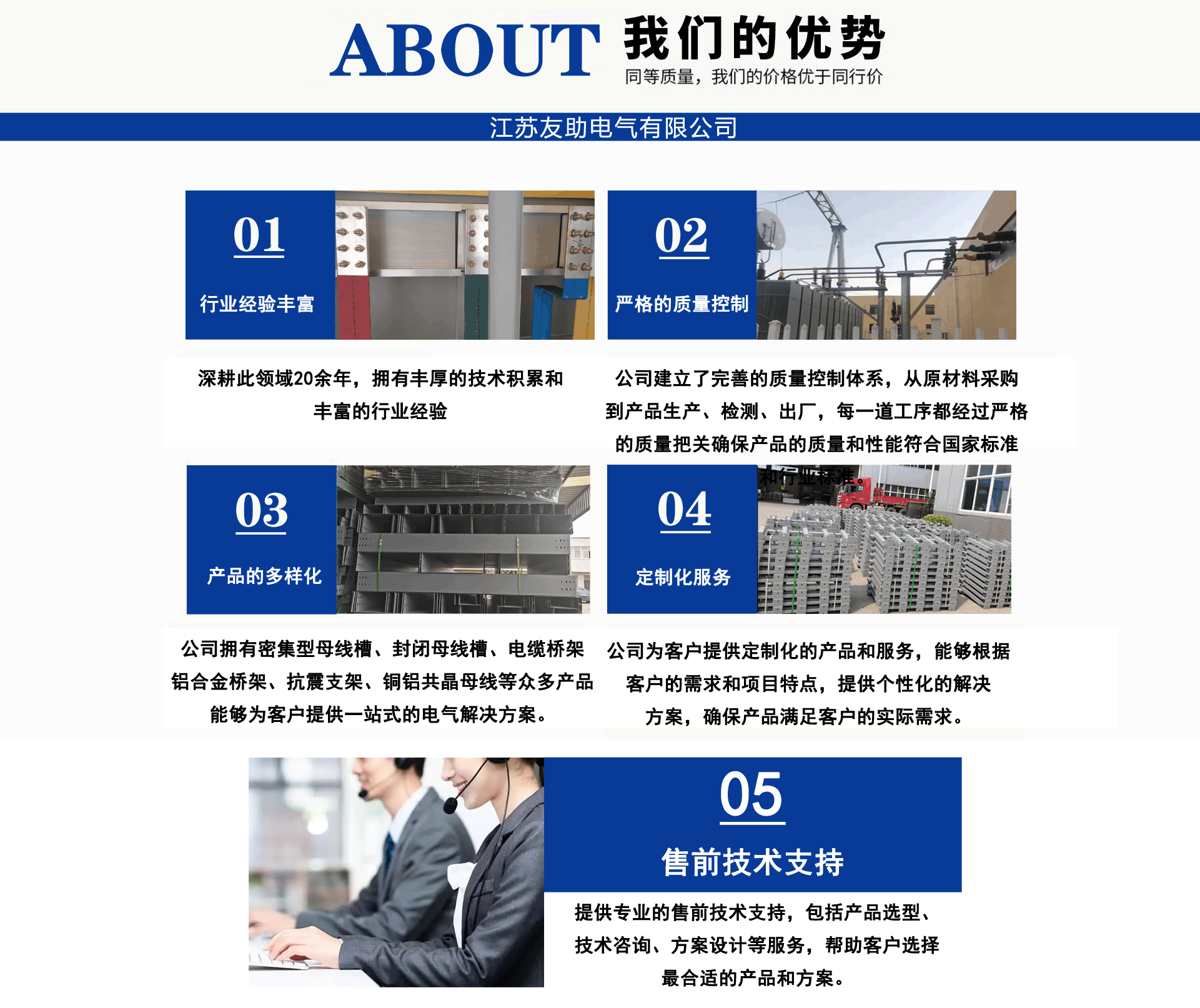 江蘇友助電氣有限公司地處中國工程電氣生產基地-一江蘇省揚中市。經營范圍:電纜橋架,母線槽(橋),管型母線,銅軟連接(伸縮節),高低壓開關柜,配電箱,抗震支架產品系列?!」咀谥迹嚎蛻糁辽?。已成功為江蘇二十屆省運會會場-泰州體育館,南京寶龍商業綜合體,張家口百兆瓦風電場,濟源市婦幼醫院,威海市未來科技園,湖北皇恩燁新材料科技有限公司,南京中央路小學,南通中天大酒店,新疆新安特鋼有限公司,河北省送變電有限公司,南京南微醫學研發基地等多項工程配套服務,我們愿與您精誠合作,互利共贏!公司技術人員深耕橋架,母線領域30年,為您提供橋架,母線槽疑難問題解決方案。母線槽不論每相是單排,雙排,三根排重疊,不管有多少個水平彎、垂直彎,轉接排在發貨前預裝一遍,確保尺寸無誤。到現場直接擰螺絲,效率高,橫平豎直,規規矩矩,符合標準,供電局,業主,監理,驗收易通過。供貨周期3-7天。為了讓尊貴客戶您,設備安全通電,高枕無憂。我們提供如下售前售中售后服務: 售前:免費技術支持,咨詢?!∈壑?免費現場精確測繪、設計?!∈酆?安裝服務,免費指導。 質量是生命,客戶是源泉。承諾客戶的,一定全力做到。讓我們一起進步!...